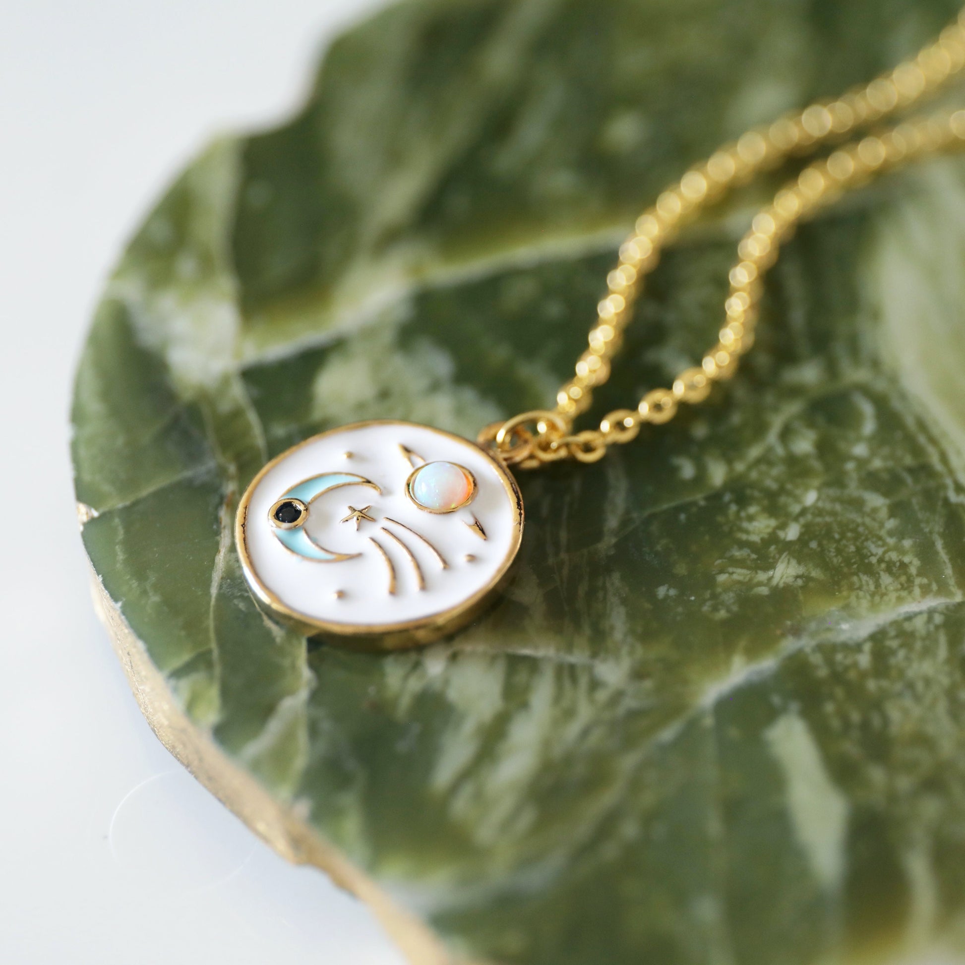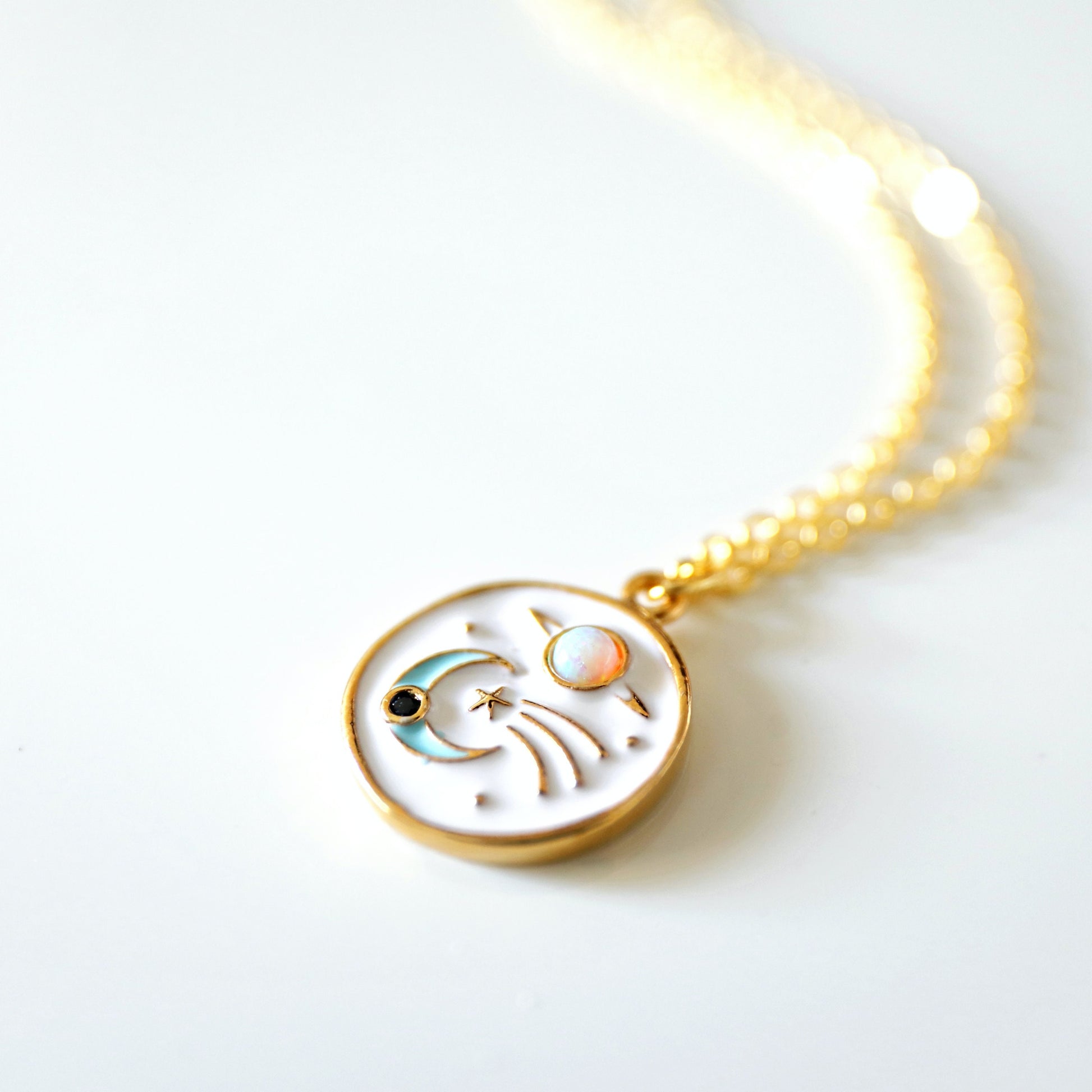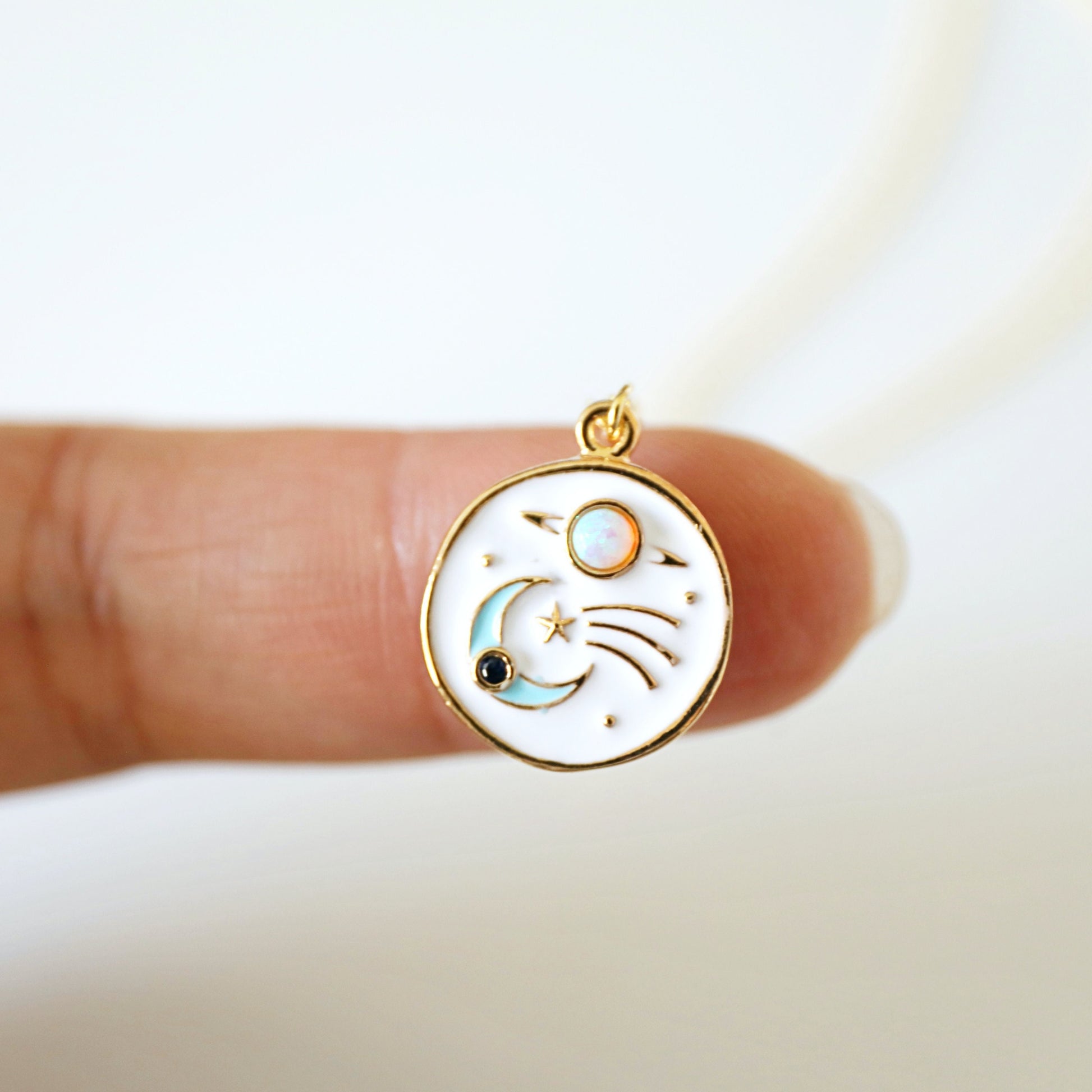 Beautiful and lovely universe charm necklace made of the moon, star, and Saturn universe white enamel round charm with skinny gold plated brass chain. There is tiny opal stone Simple and warm. The necklace is good for yourself or a gift! Your necklace will ship in a rudiana gift box. ♥Chain length 14"- 20" ♥Charm 5/8" ♥Gold plated over brass /Opal stone /Enamel ♥ Delivery Time Fast shipping within 1 - 3 days