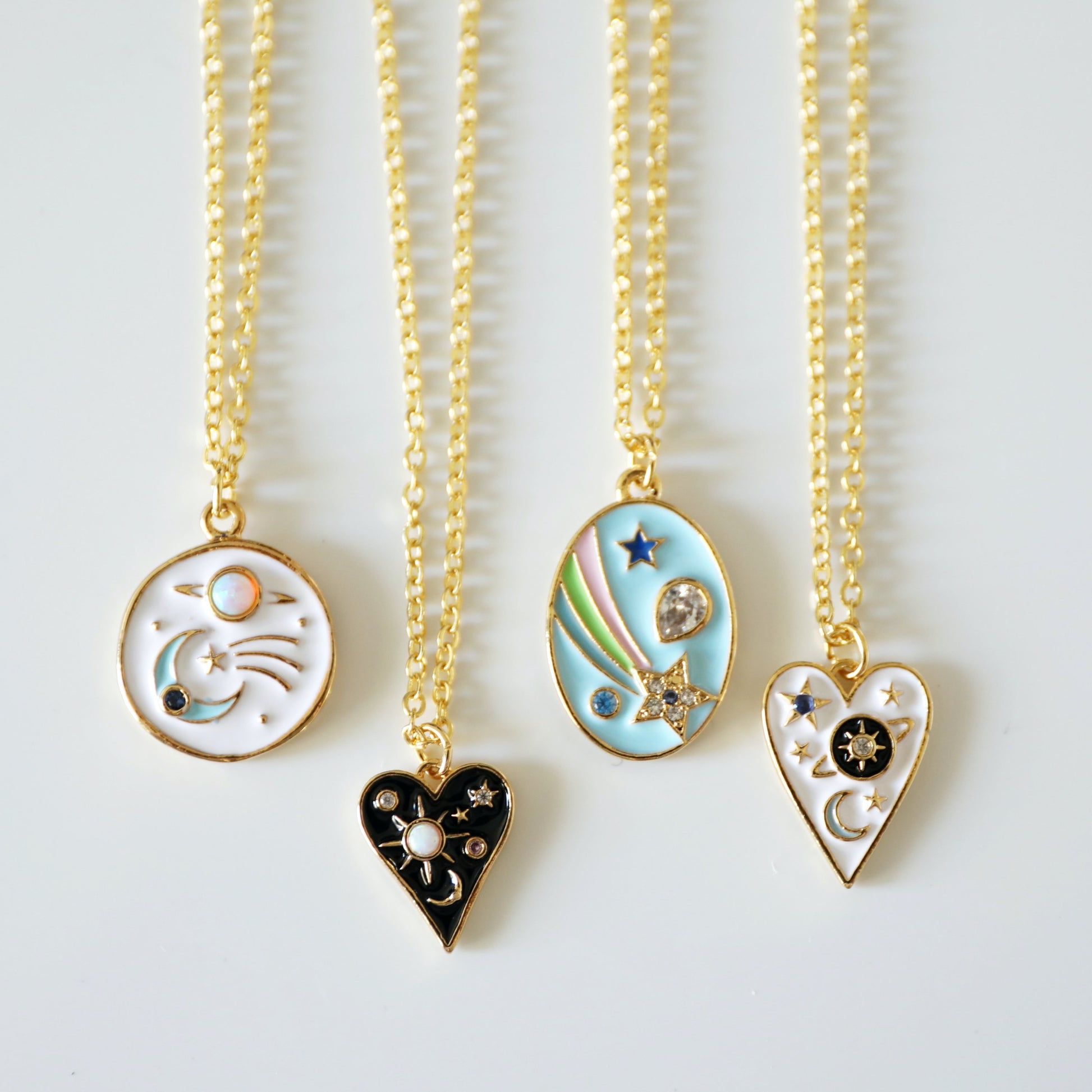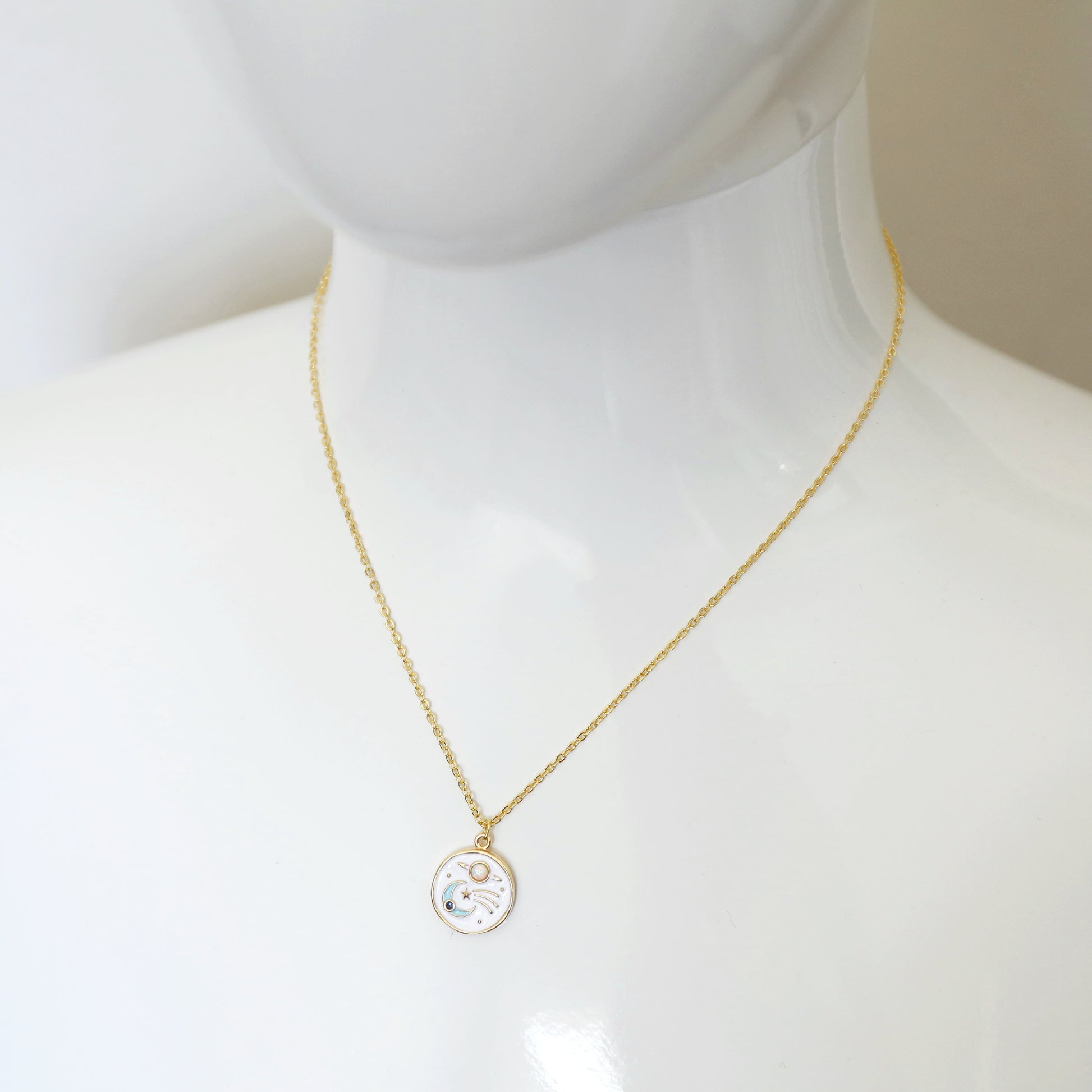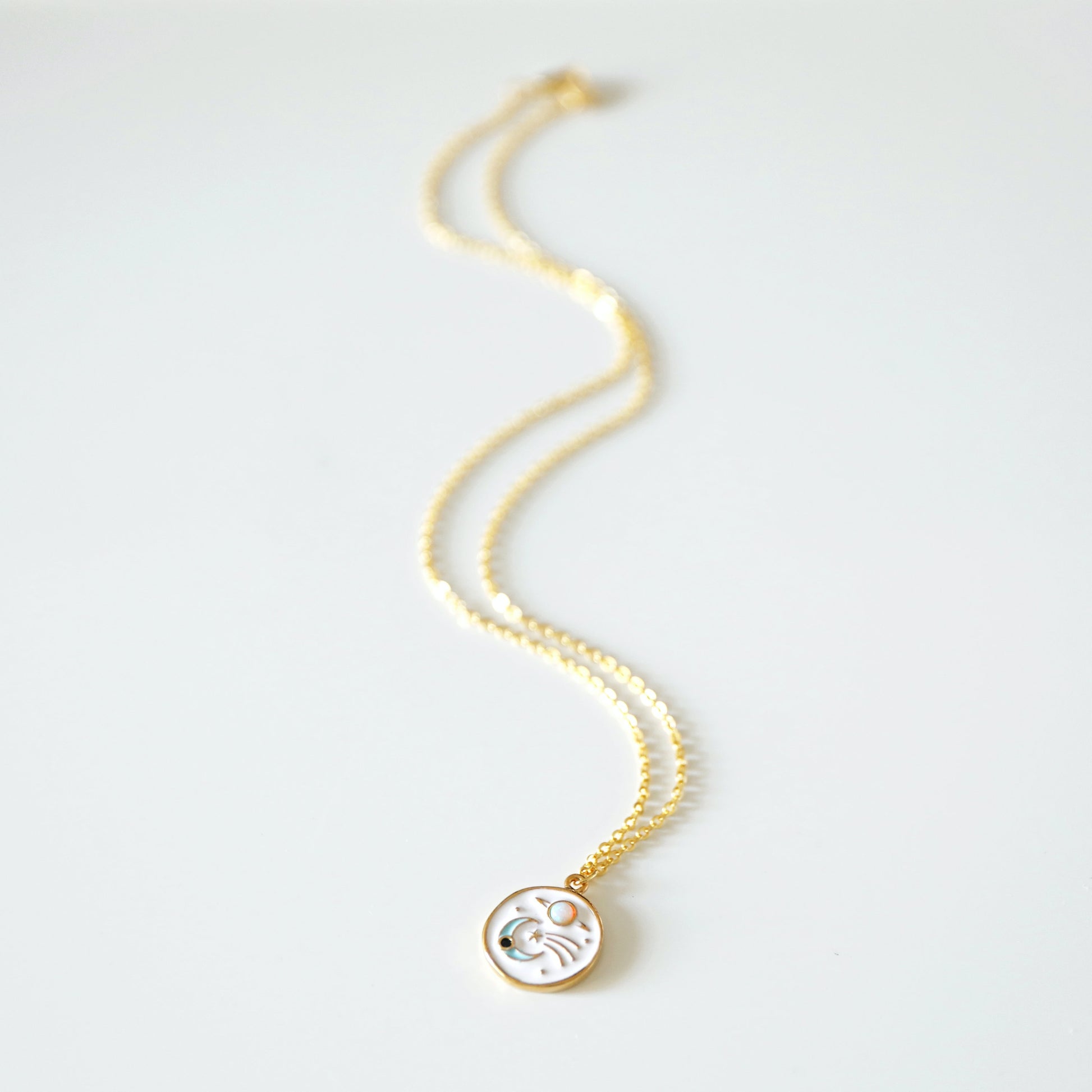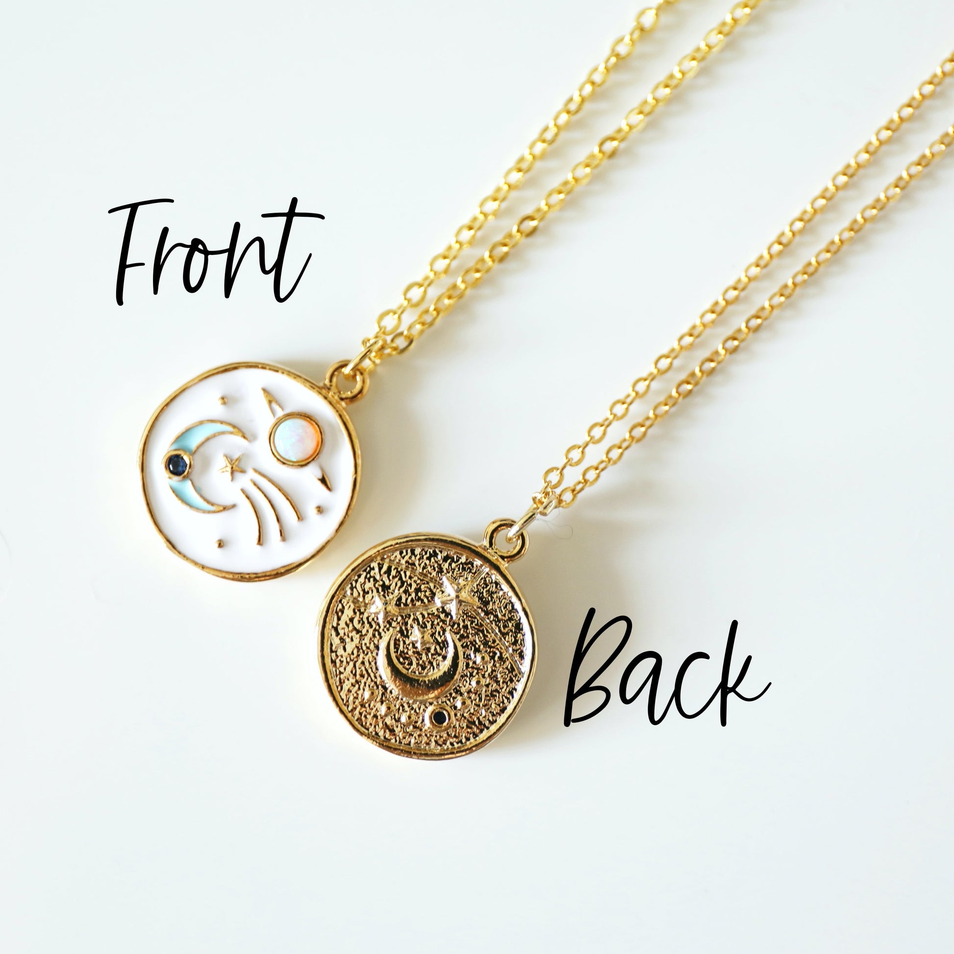 Beautiful and lovely universe charm necklace made of the moon, star, and Saturn universe white enamel round charm with skinny gold plated brass chain. There is tiny opal stone Simple and warm. The necklace is good for yourself or a gift! Your necklace will ship in a rudiana gift box. ♥Chain length 14"- 20" ♥Charm 5/8" ♥Gold plated over brass /Opal stone /Enamel ♥ Delivery Time Fast shipping within 1 - 3 days