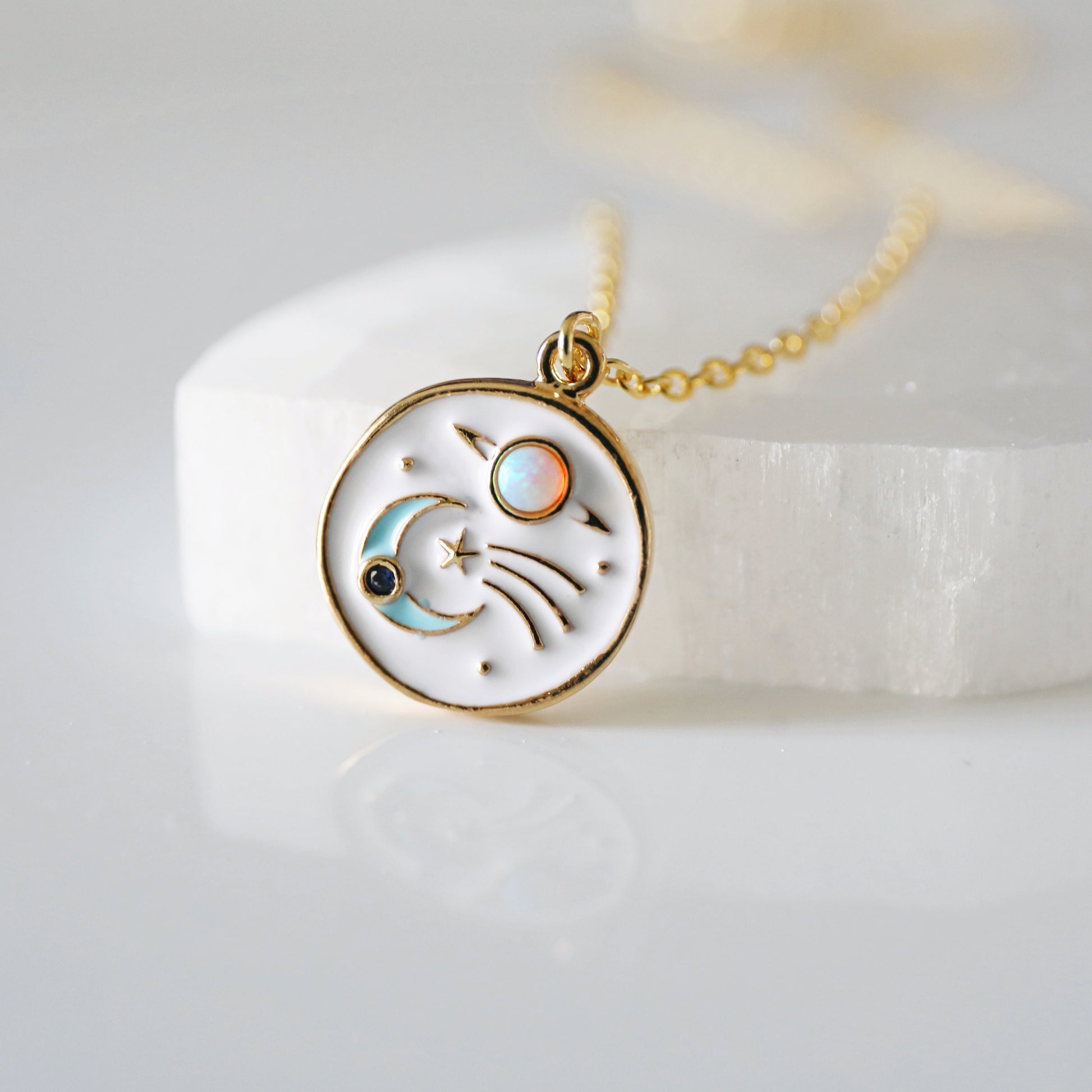 Celestial Necklace, Moon and Star Necklace, Planet Opal Necklace, Universe Jewelry, Spiritual Jewelry, Gift for Her, Minimalist Jewelry