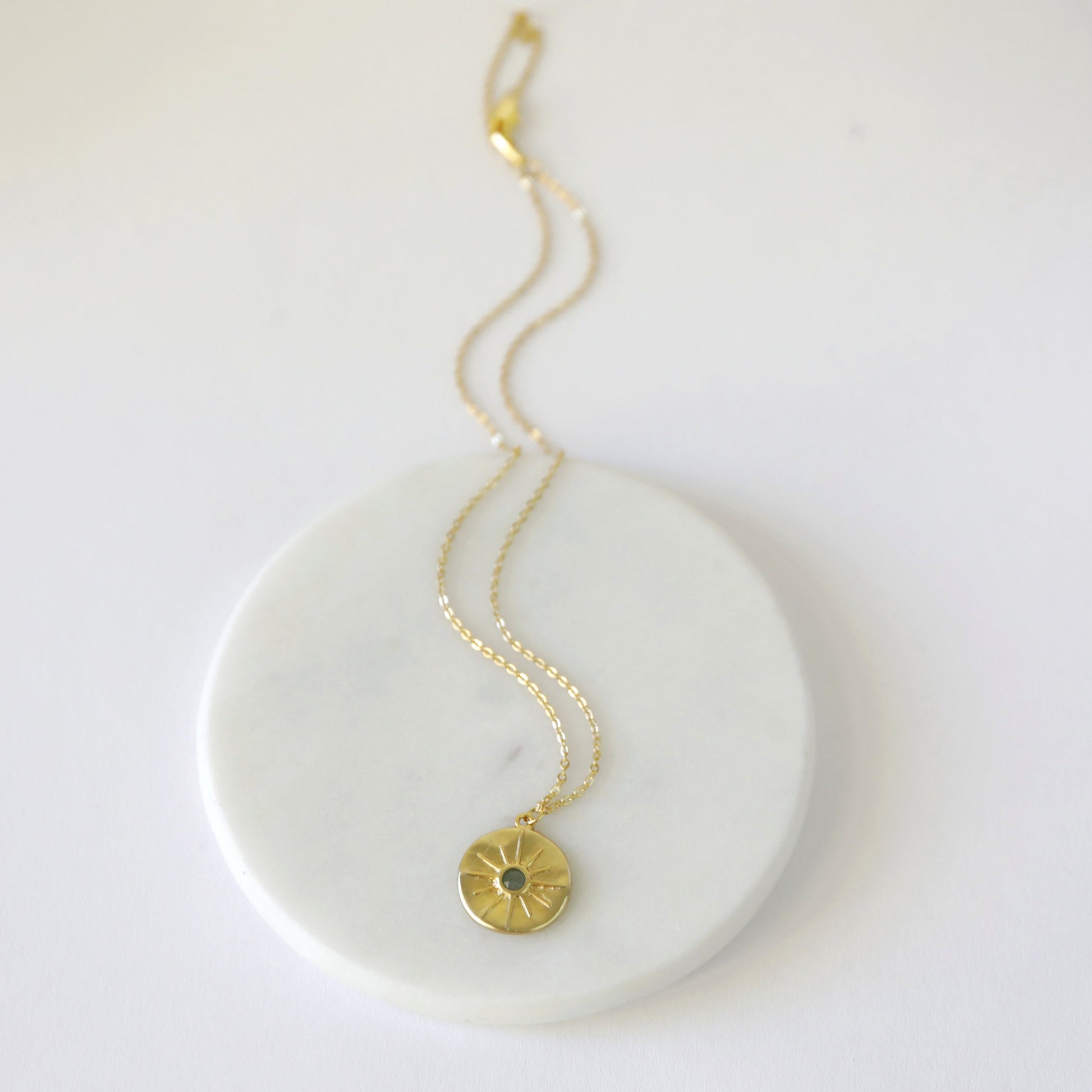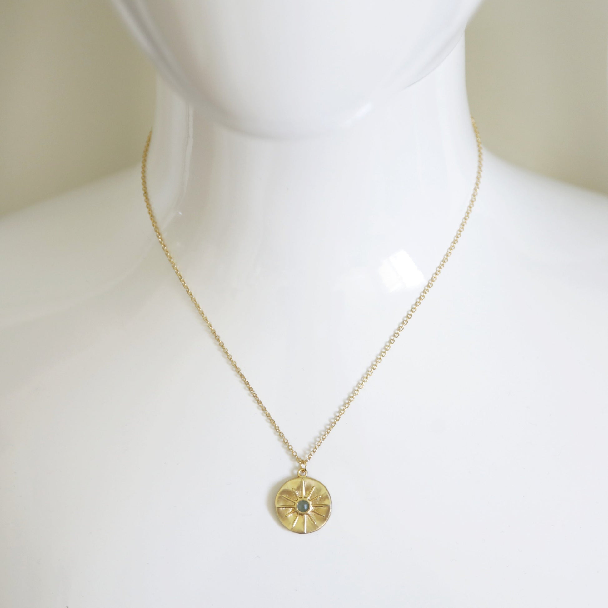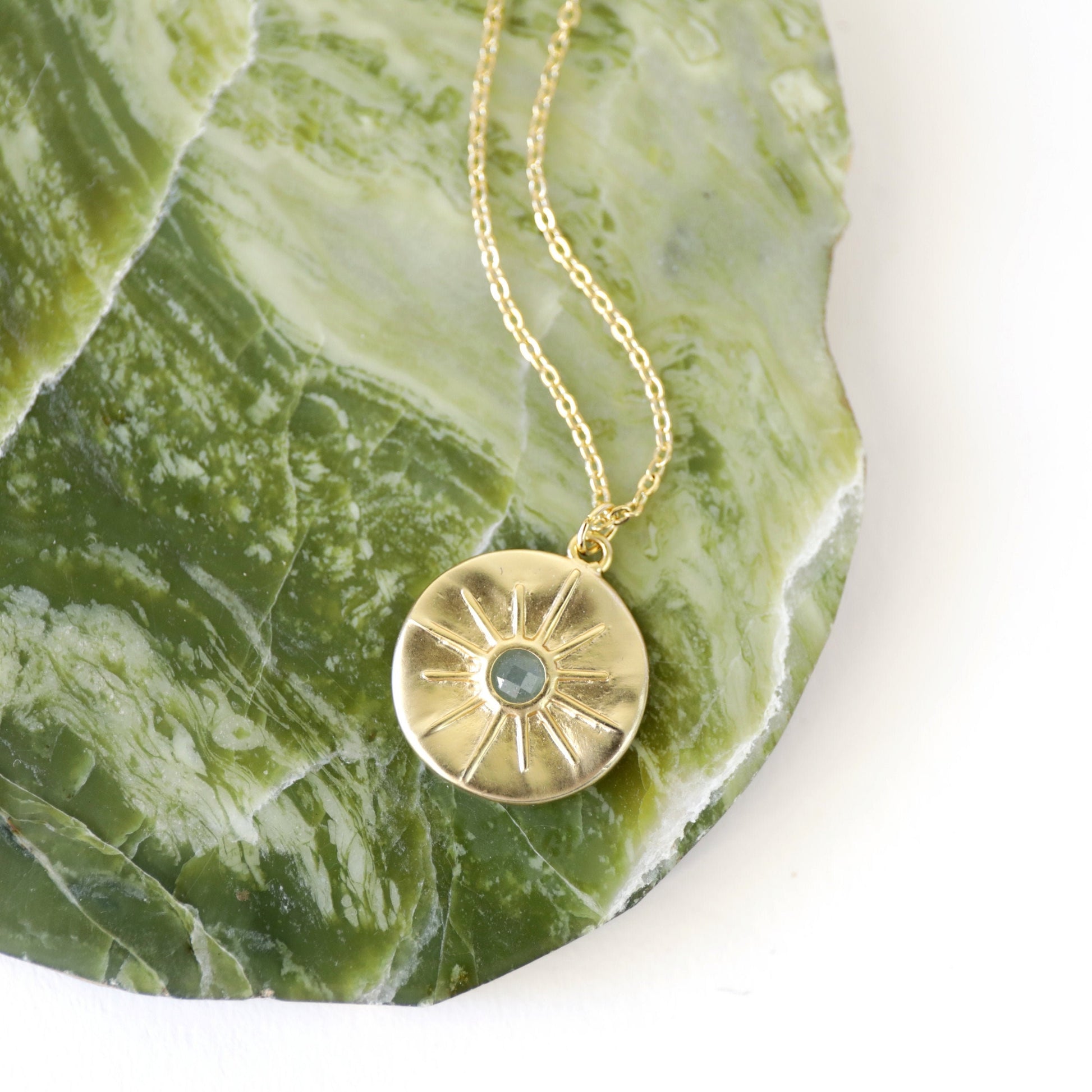 Beautiful and lovely gold star round charm necklace. Made of matte gold finish Green Aventurine stone star round charm with skinny gold plated brass chain. Simple and warm. Necklace will ship in a gift box. If you have any question, please feel free to contact me. Thanks :) ♥ Necklace length 16"+2" extend chain ♥ Charm 3/4" ♥ Gold plated over brass/ Green Aventurine ♥ Delivery Time Fast shipping within 1 - 3 days