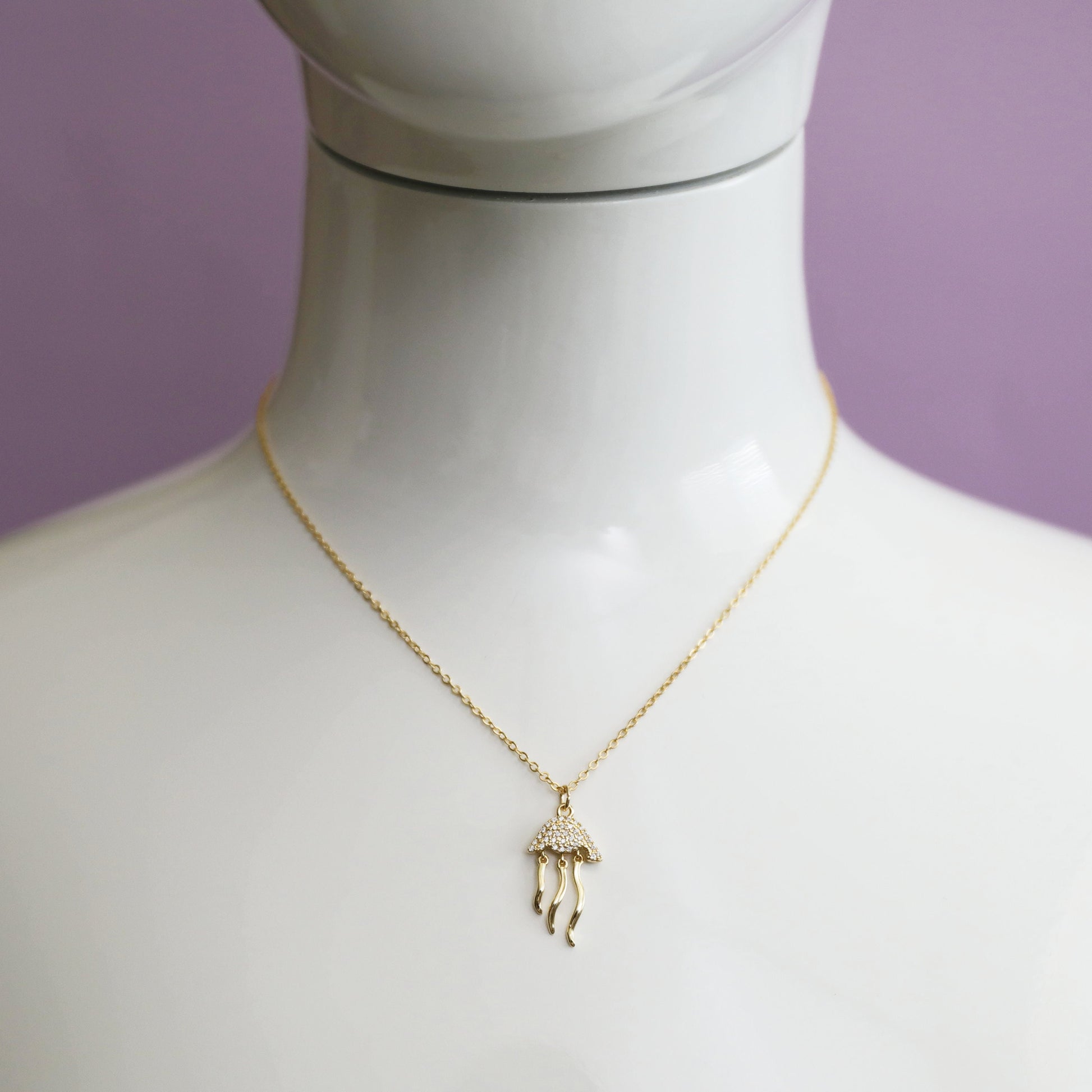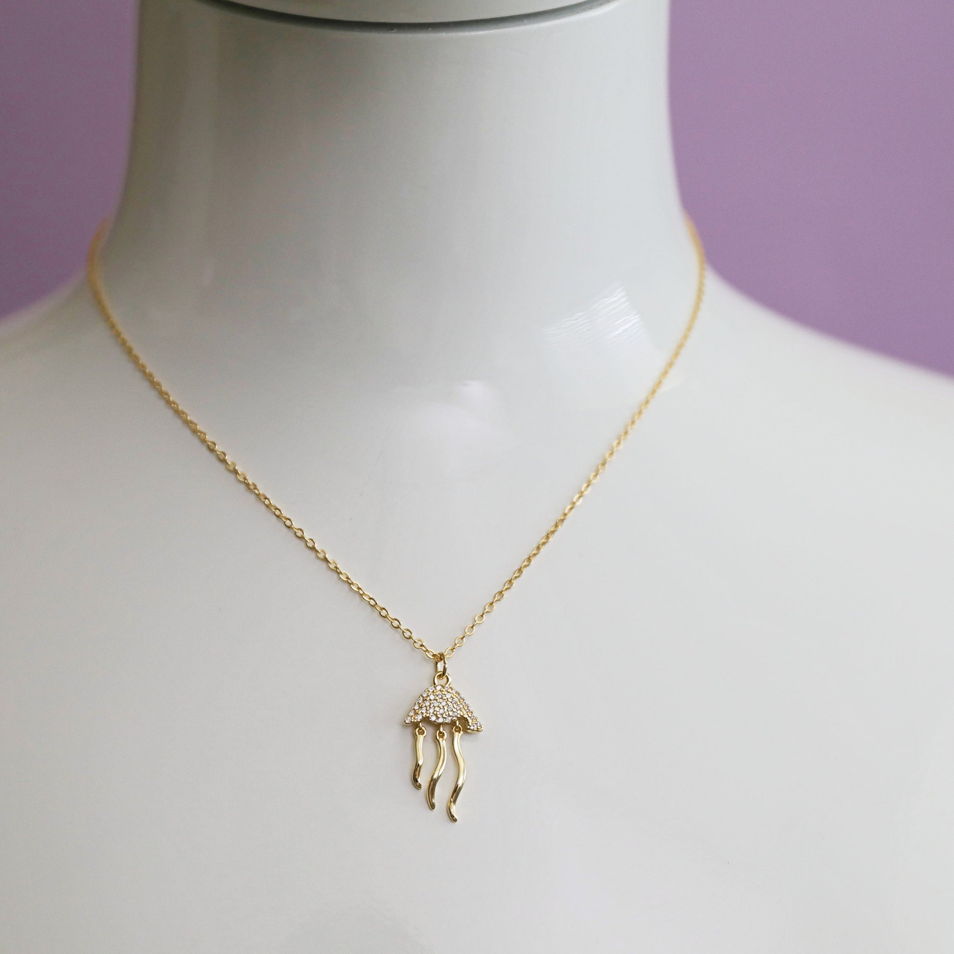 Beautiful and lovely jellyfish charm necklace made of CZ stone gold jellyfish charm with skinny gold plated brass chain. A simple and cute-looking dainty necklace is good for yourself or gift! Your necklace will ship in a gift box. If you have any questions please feel free to contact me. Thanks :) ♥Chain length 16"+2" extend chain ♥Jellyfish 1/2" x 1" ♥Gold plated brass / Cubic Zirconia ♥ Delivery Time Fast shipping within 1 - 3 days