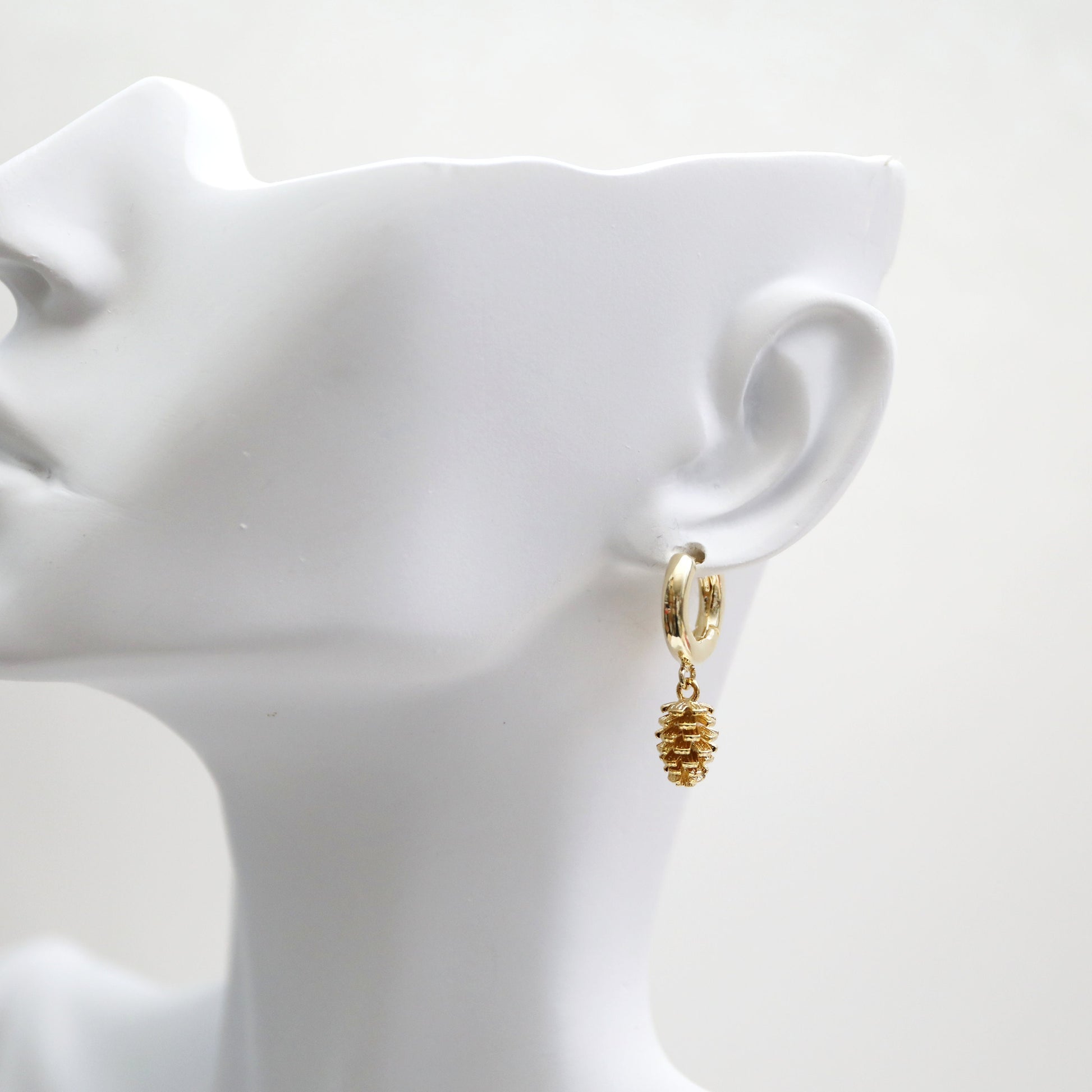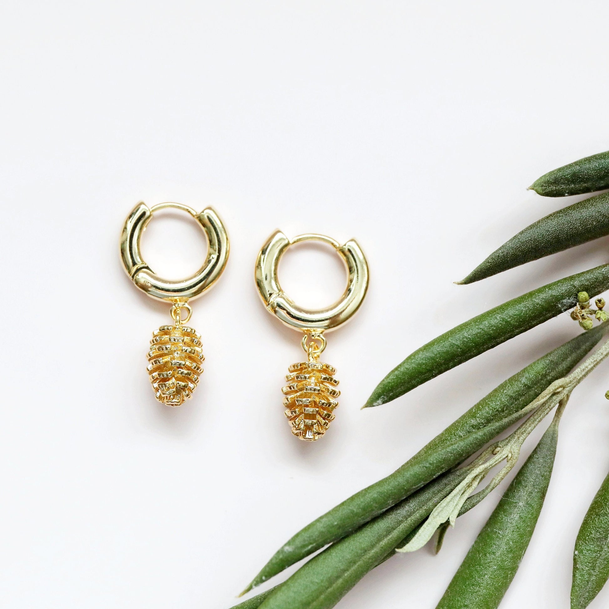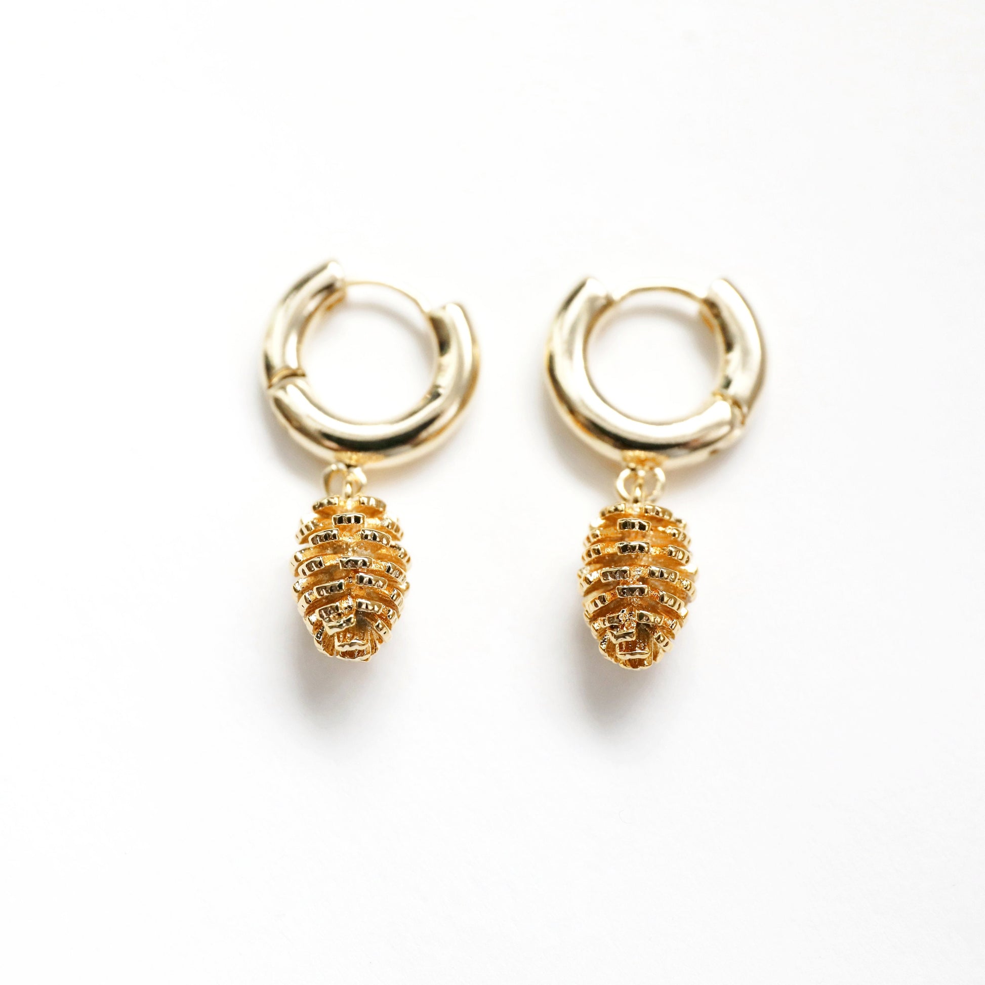 Beautiful and lovely pinecone earrings. 1/2" huggie hoop dangling with gold piencone charm. Soft and warm. Great for gift, everyday or special occasions. Your item will ship in a gift box. Please feel free to contact me if you have any questions. ♥ Huggie earrings 1/2" ♥ Pinecone 3/8" ♥ Sold as a pair ♥ Real 14K gold plated ♥ Creation Time: 1 - 3 days