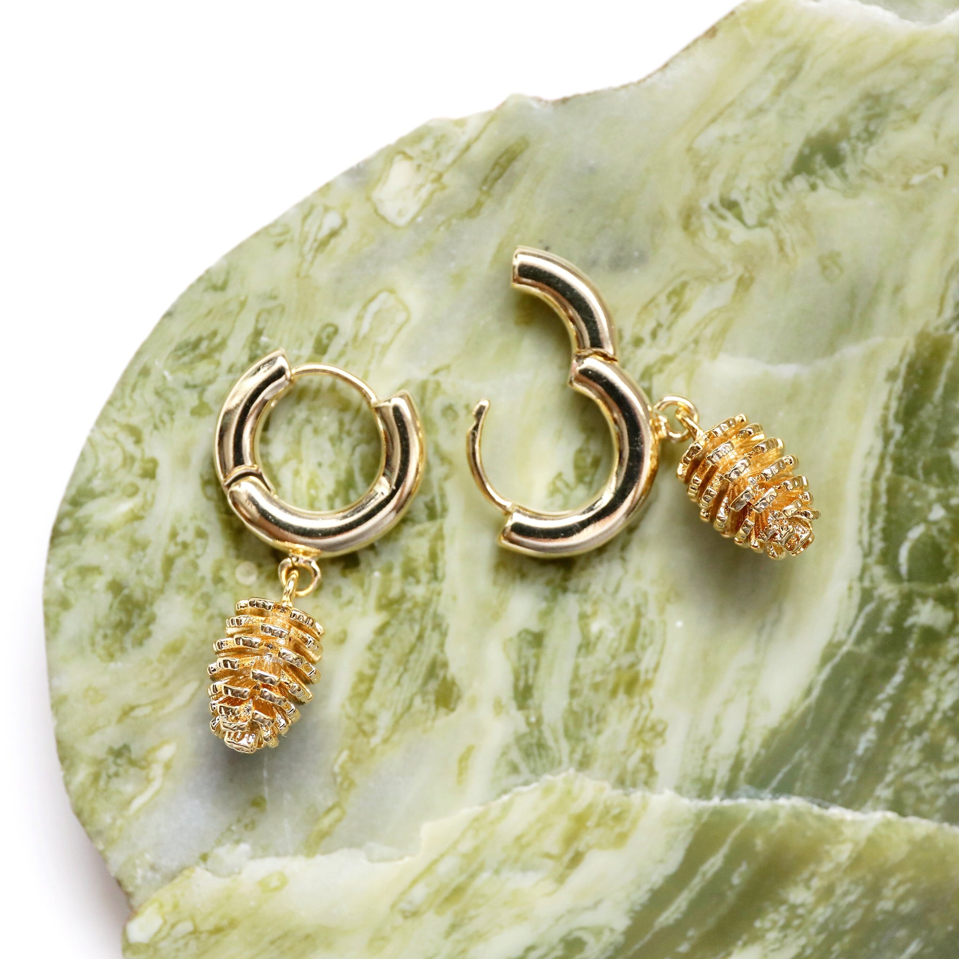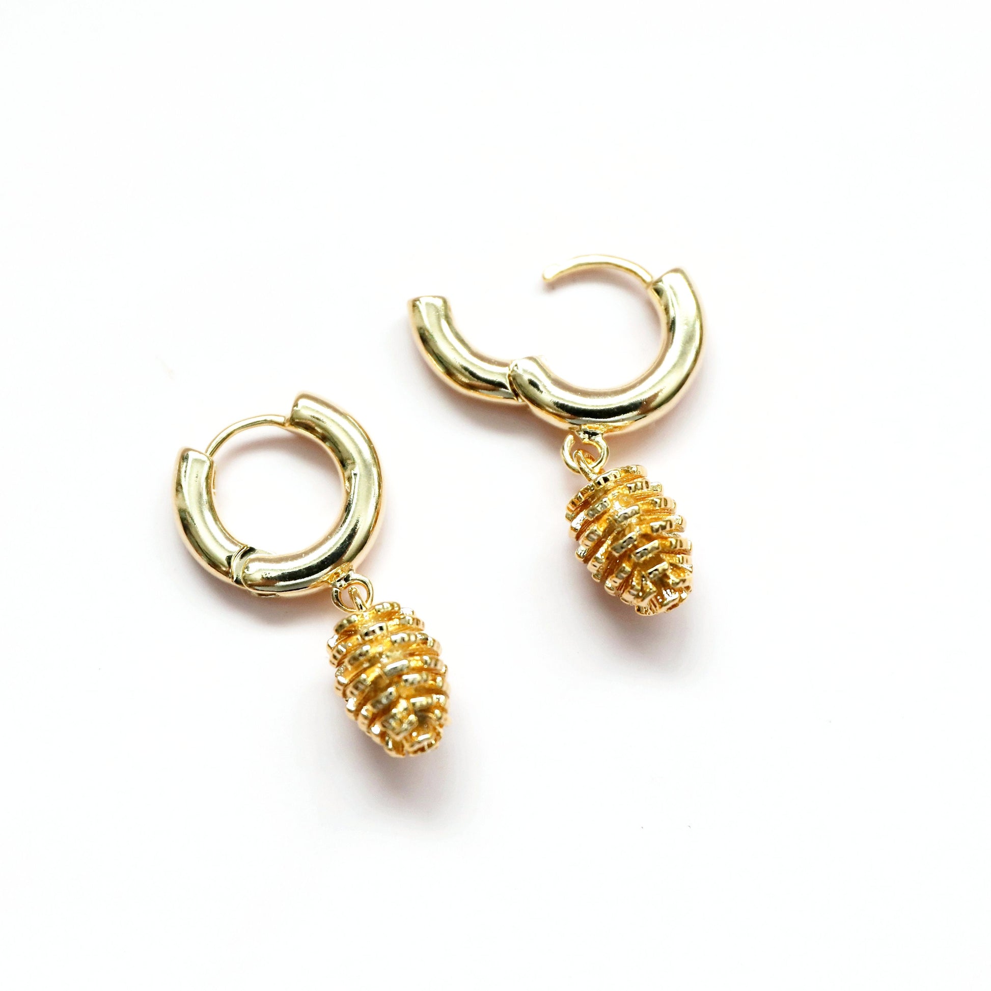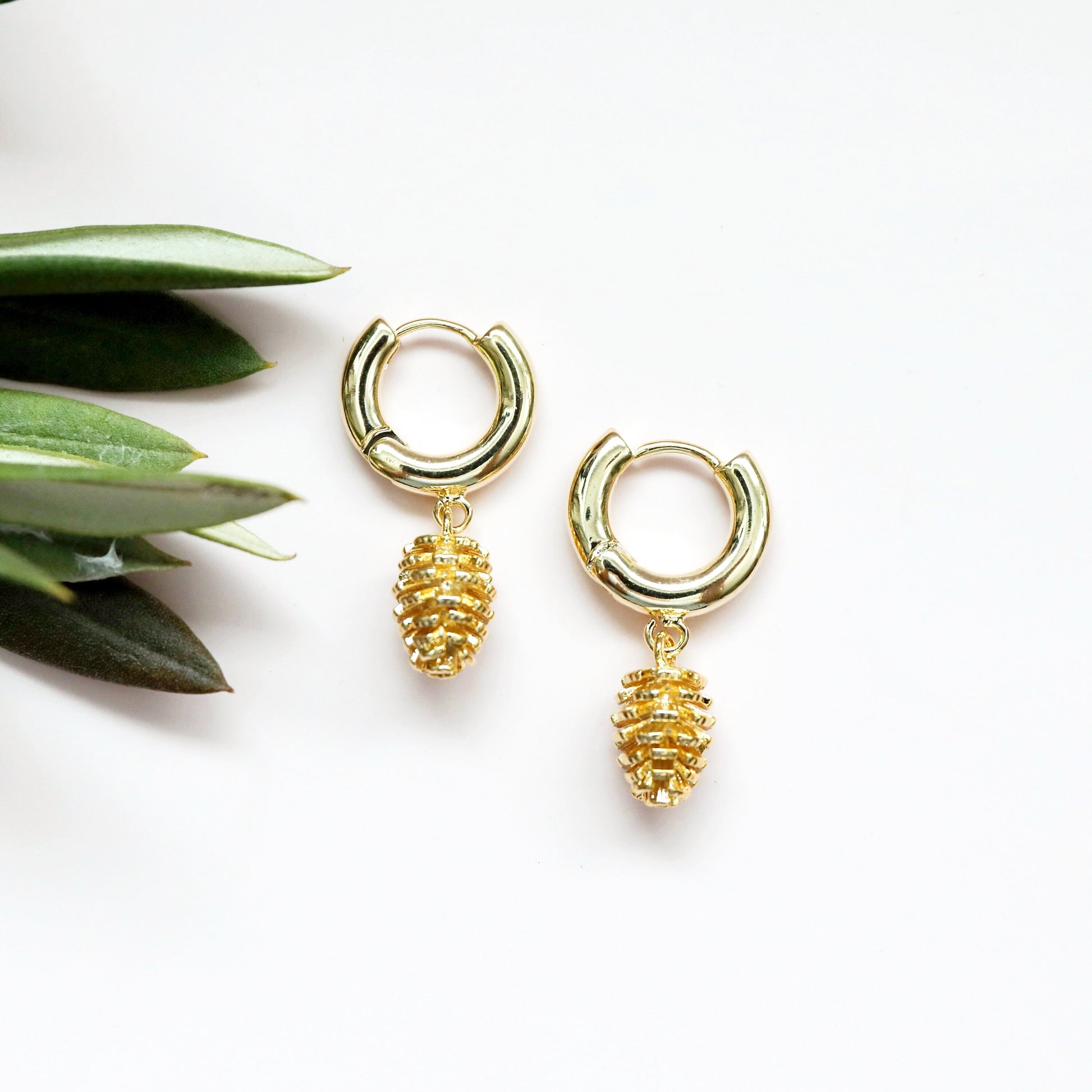 Beautiful and lovely pinecone earrings. 1/2" huggie hoop dangling with gold piencone charm. Soft and warm. Great for gift, everyday or special occasions. Your item will ship in a gift box. Please feel free to contact me if you have any questions. ♥ Huggie earrings 1/2" ♥ Pinecone 3/8" ♥ Sold as a pair ♥ Real 14K gold plated ♥ Creation Time: 1 - 3 days