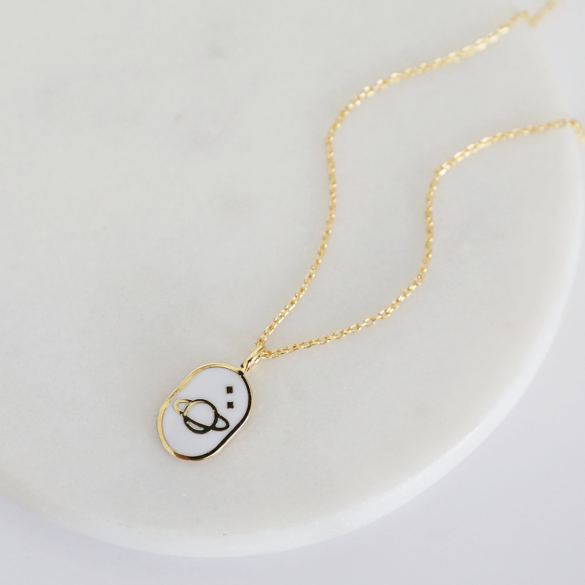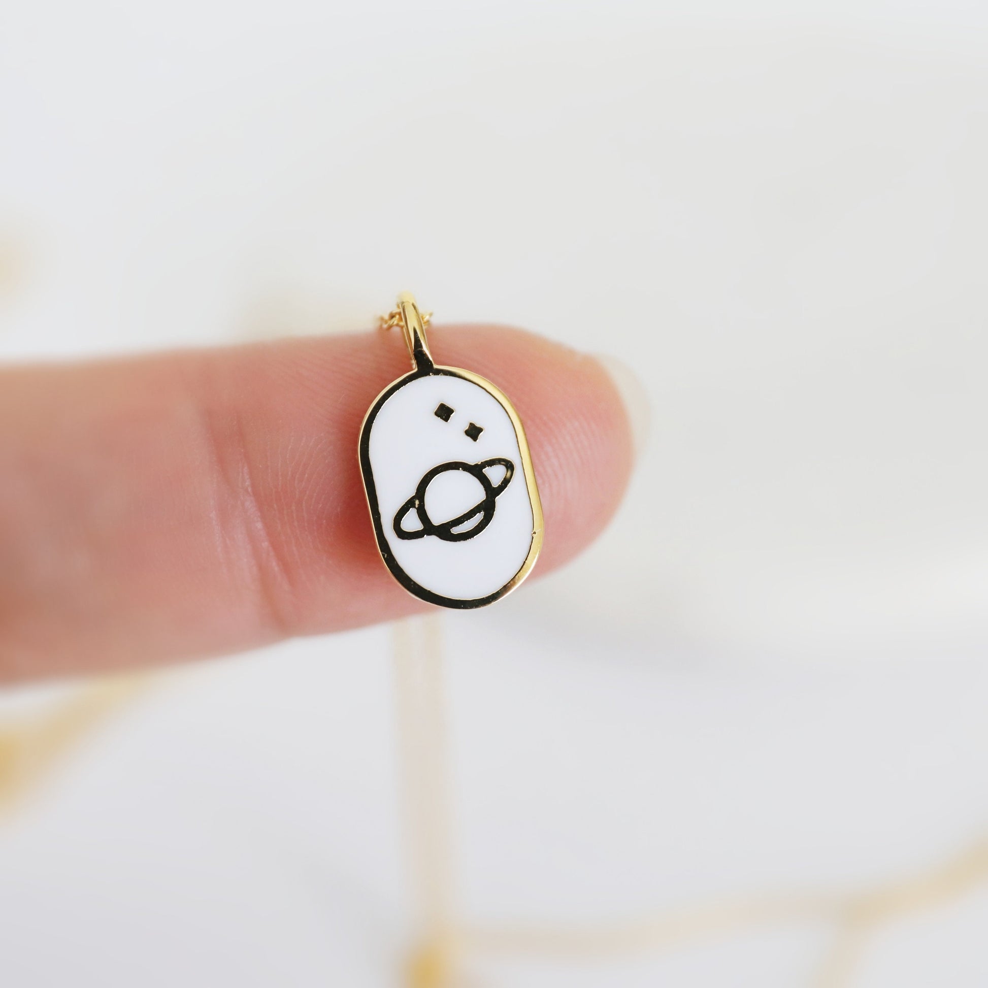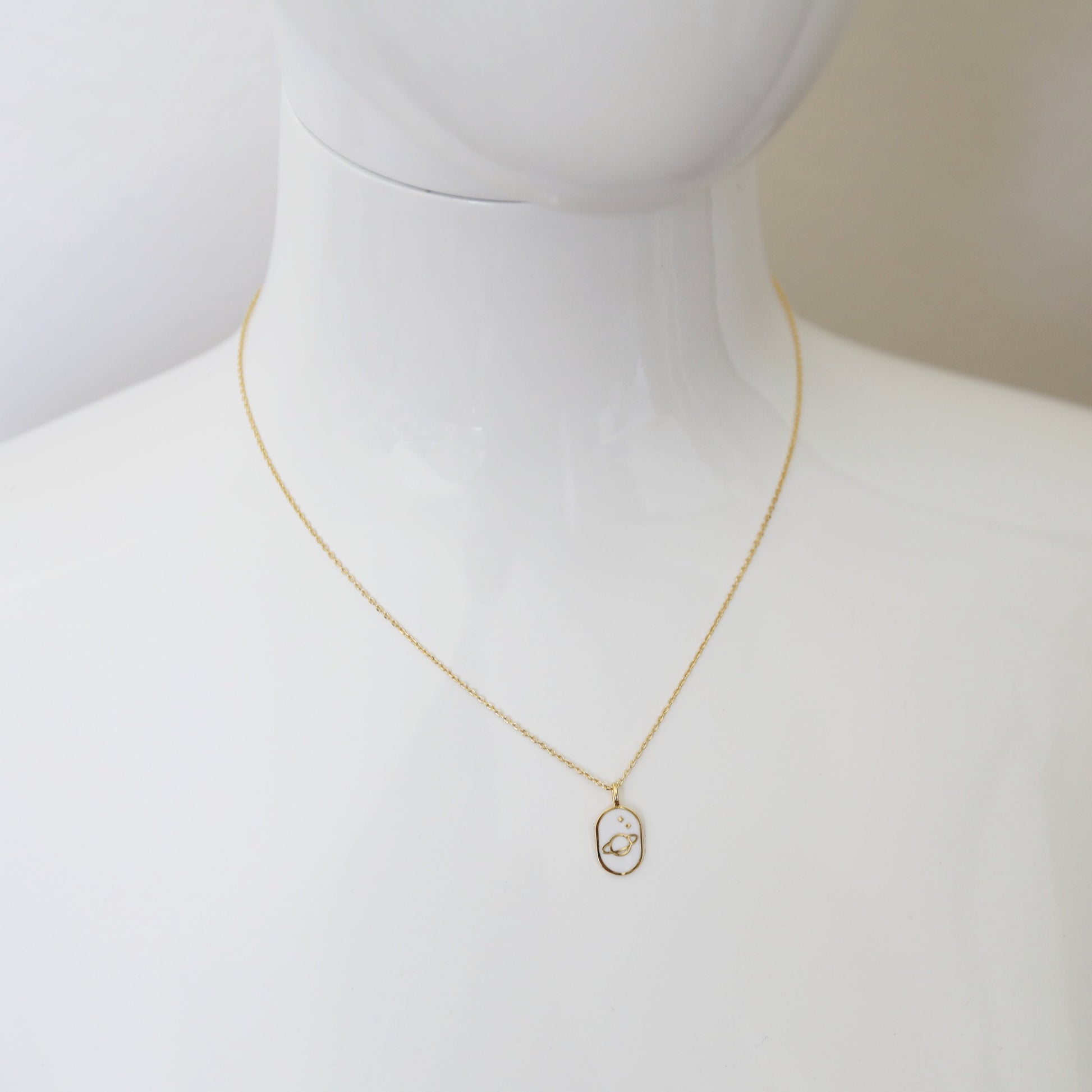 Beautiful and lovely dainty space charm necklace. Made of dainty white and gold space charm with skinny gold plated brass chain. Simple and warm. The necklace is good for yourself or gift! Your necklace will ship in a rudiana gift box. ♥Chain length 14" - 20" ♥Space charm 3/8" x 5/8" ♥Gold plated over brass / White enamel