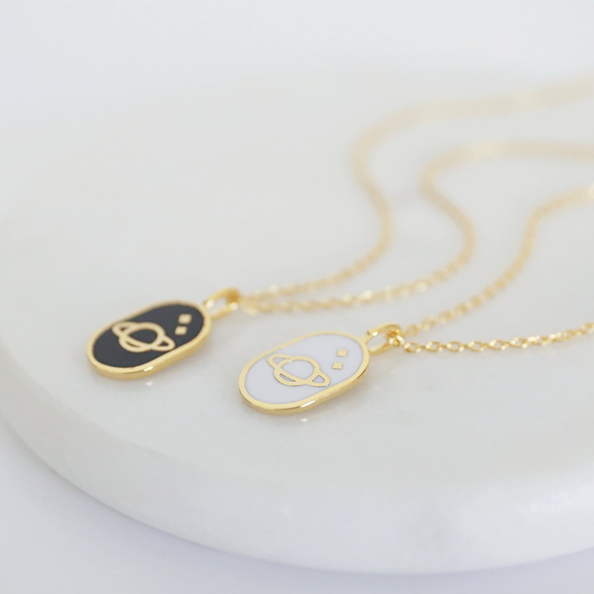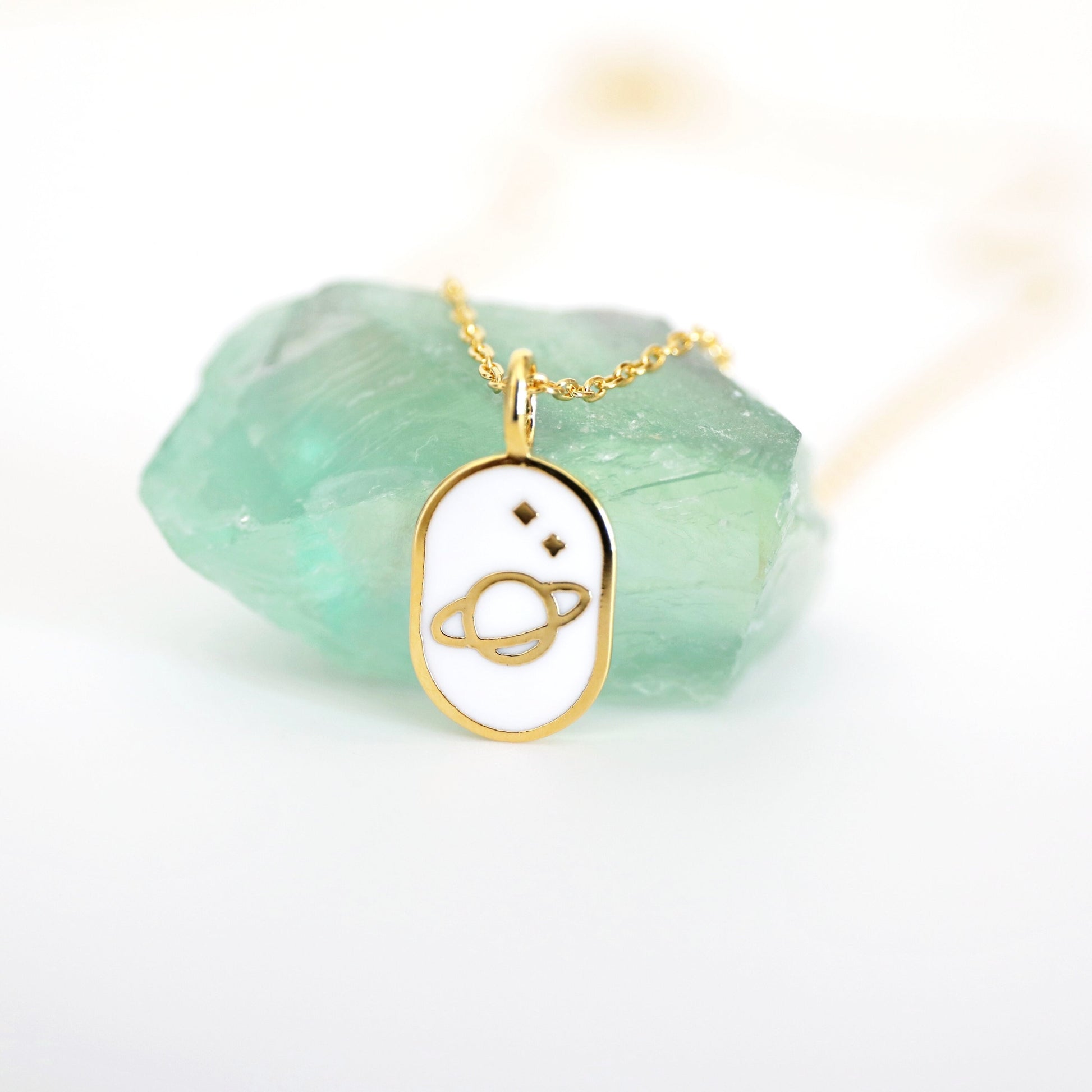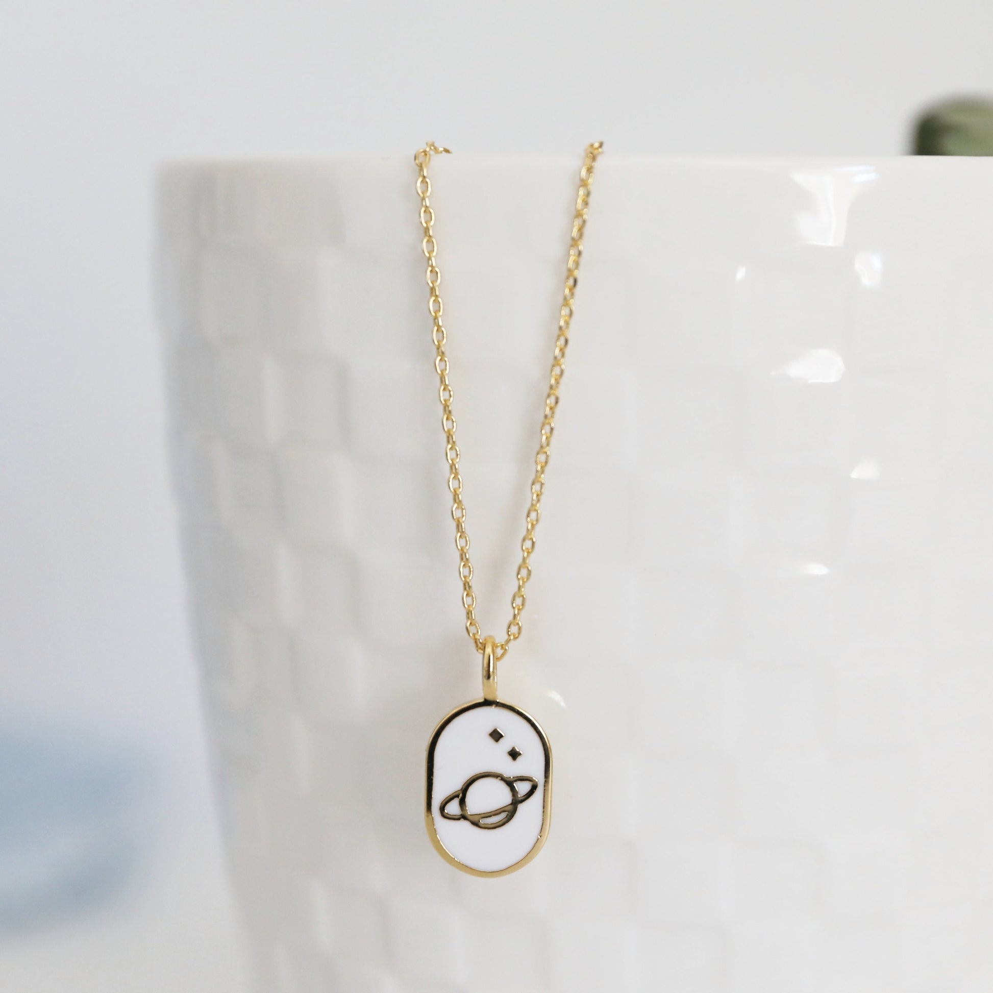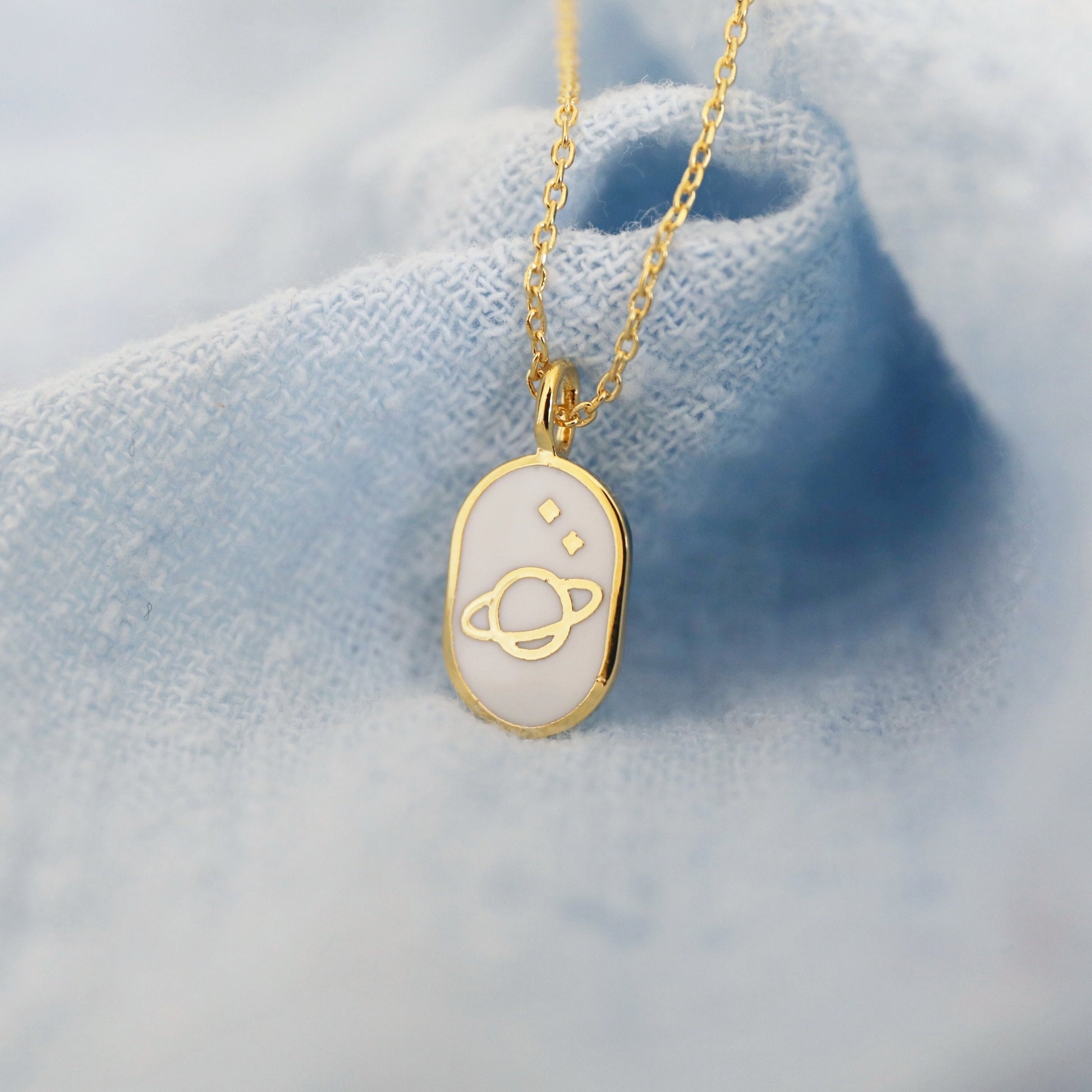Beautiful and lovely dainty space charm necklace. Made of dainty white and gold space charm with skinny gold plated brass chain. Simple and warm. The necklace is good for yourself or gift! Your necklace will ship in a rudiana gift box. ♥Chain length 14" - 20" ♥Space charm 3/8" x 5/8" ♥Gold plated over brass / White enamel