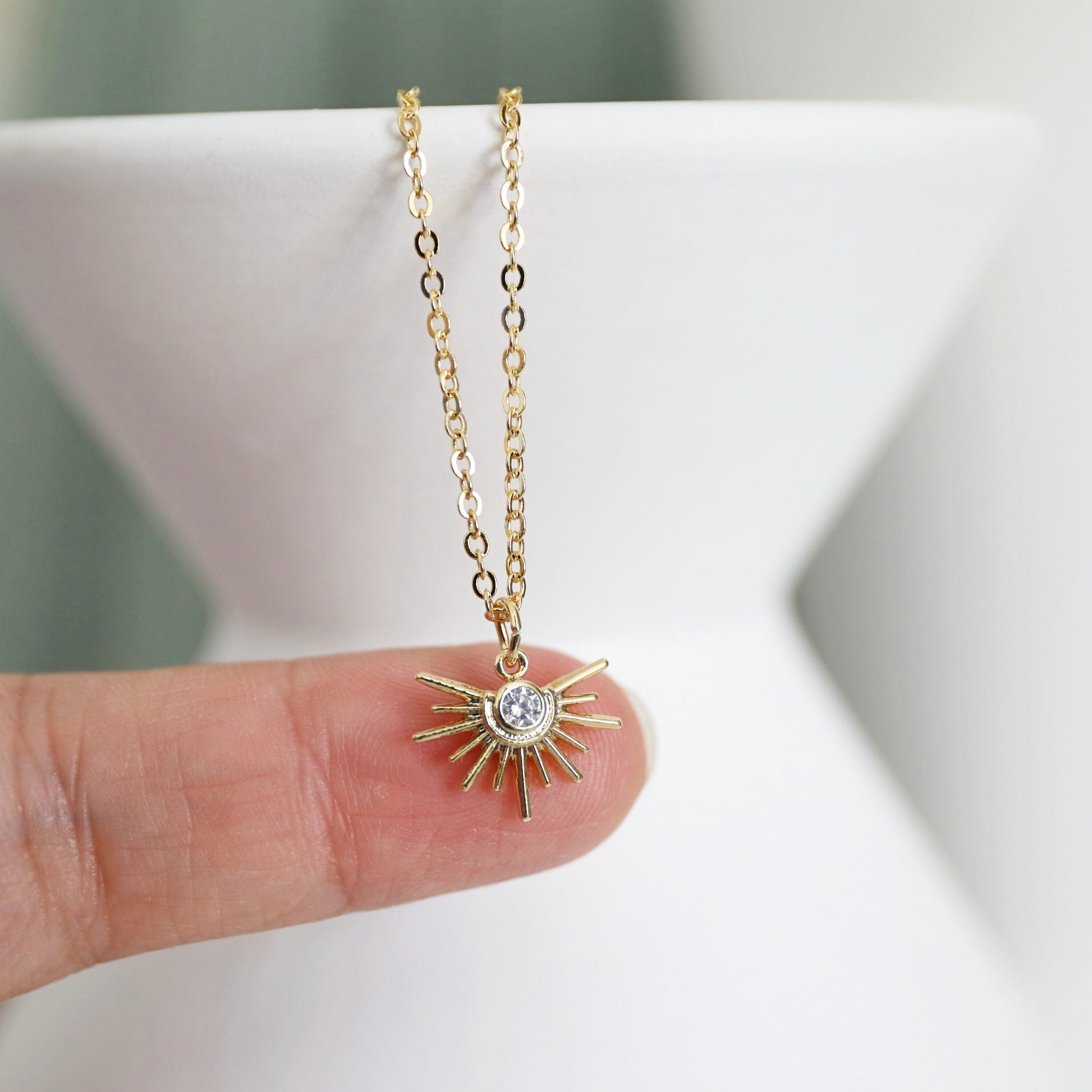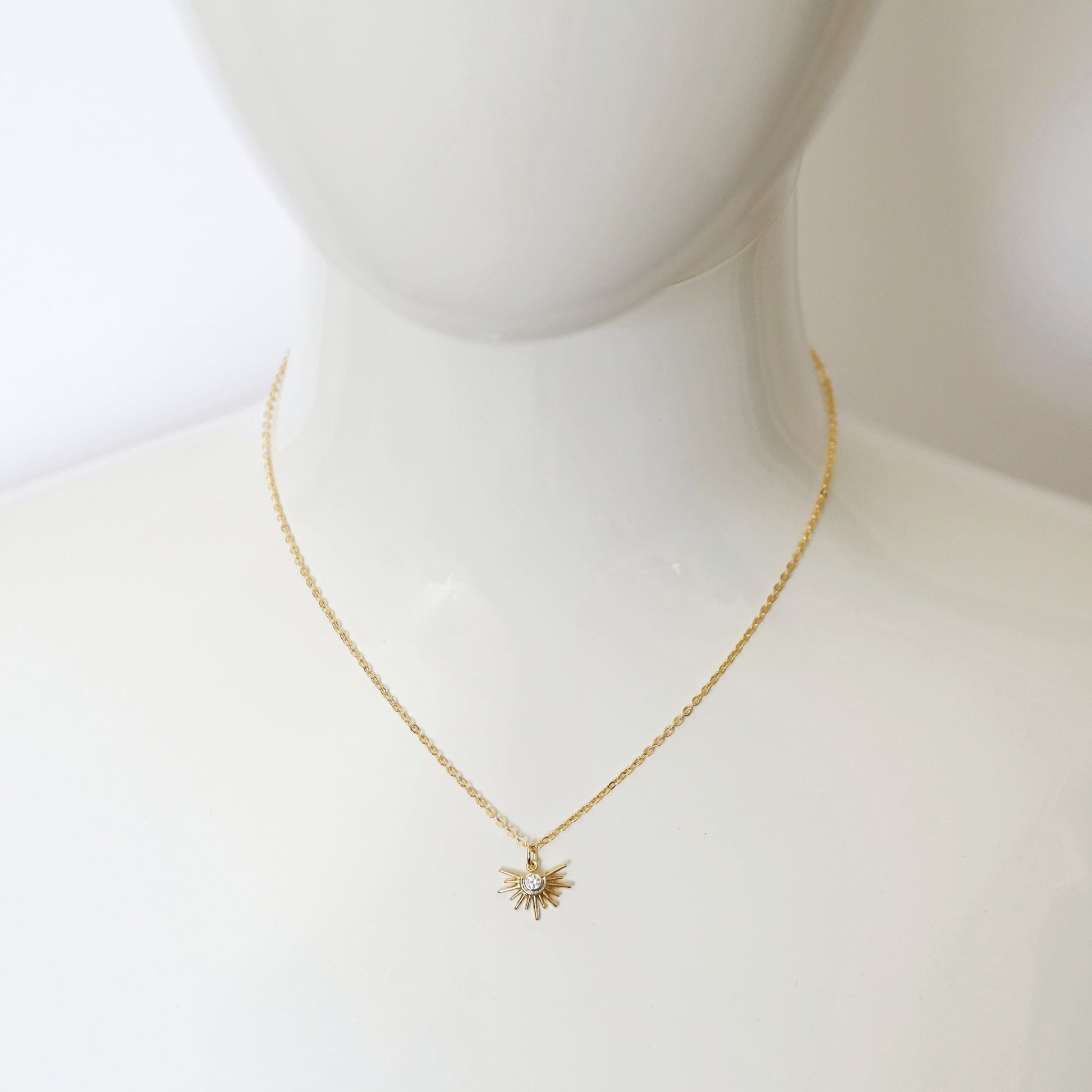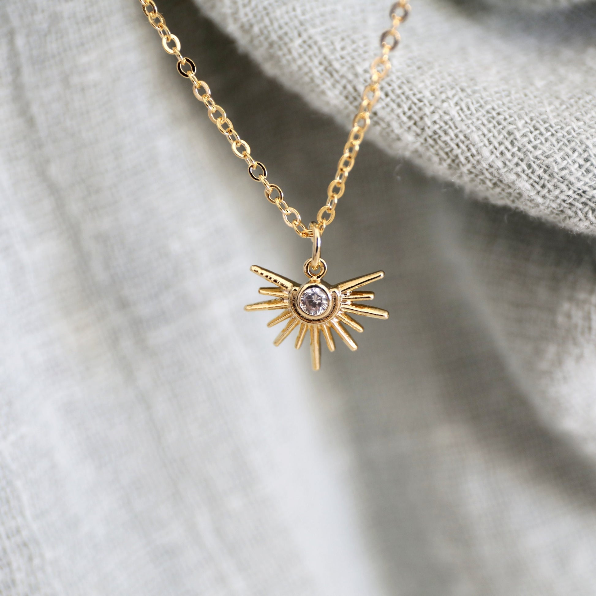 Beautiful and lovely tiny gold sun pendant necklace. Made of tiny crystal cubic zirconia stone gold sun charm with a skinny gold plated brass chain. Soft and simple. Great for gift, everyday or special occasions. Your item will ship in a gift box. Please feel free to contact me if you have any questions. ♥ April Birthstone Necklace ♥ Length 14" - 20" chain ♥ Sun charm 1/2" ♥ Gold plated over brass/ Cubic Zirconia