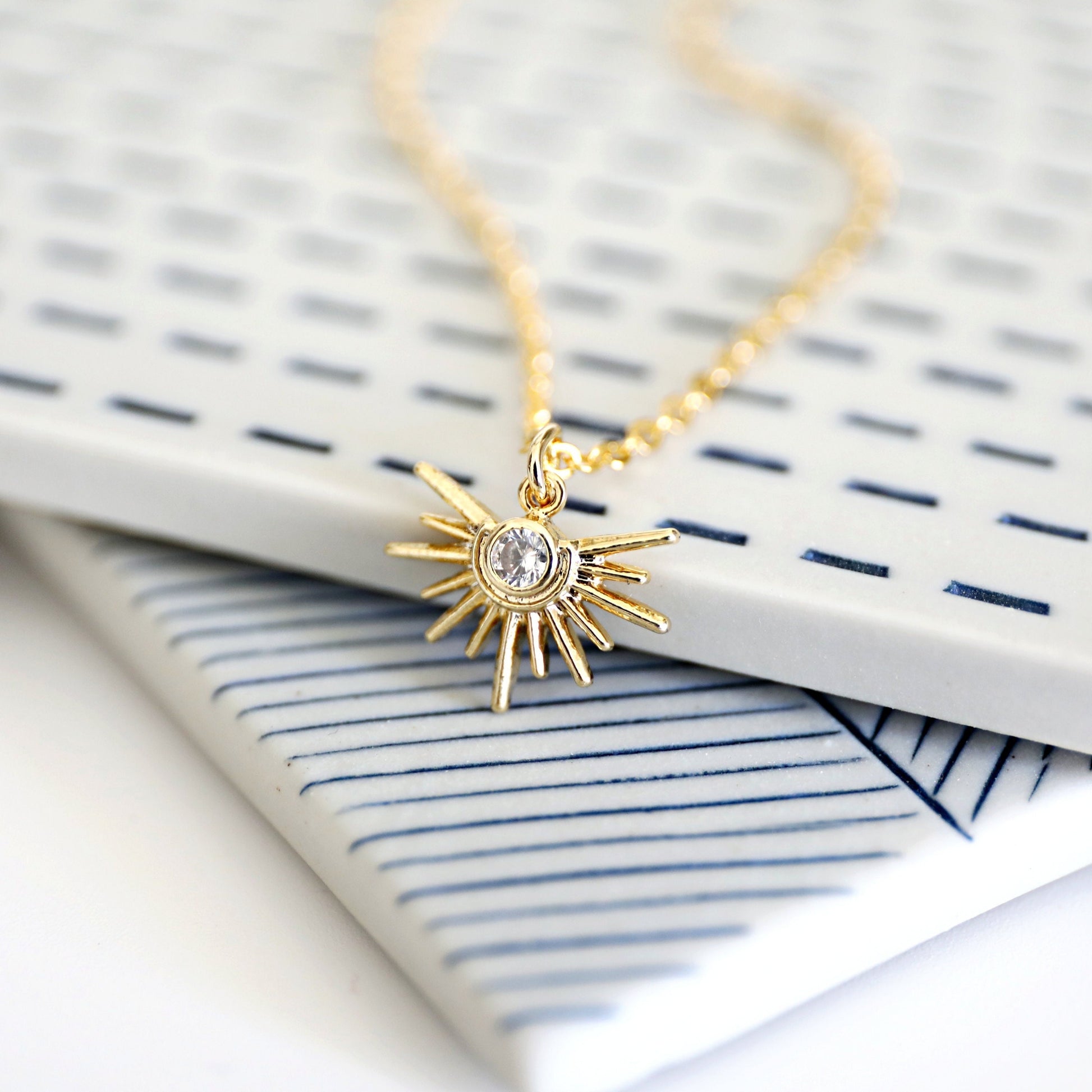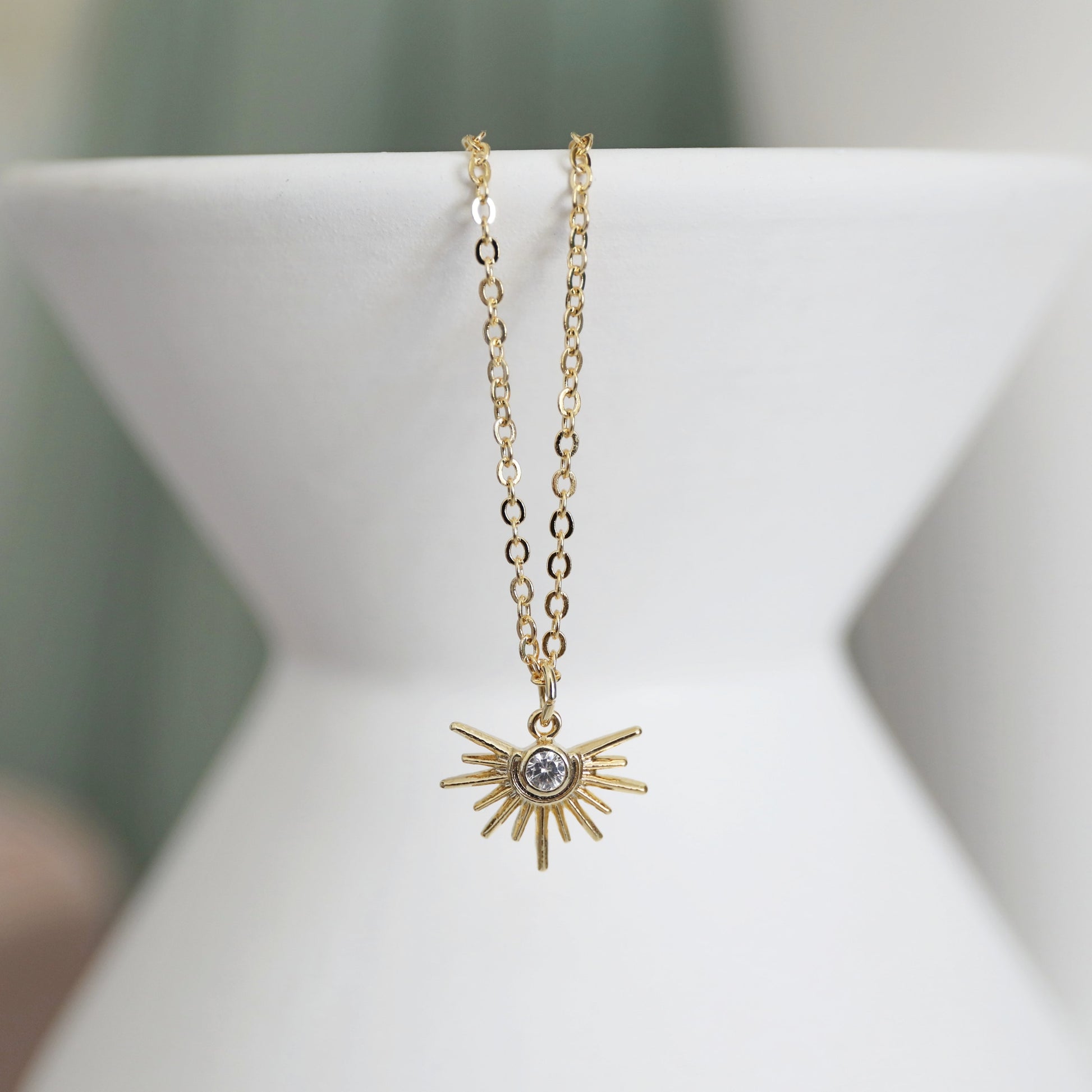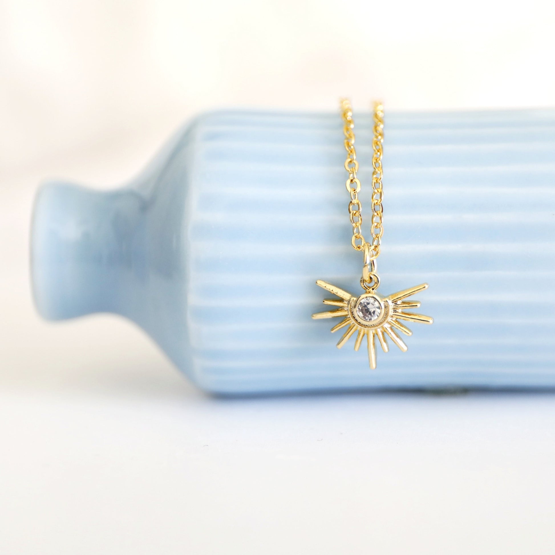 Beautiful and lovely tiny gold sun pendant necklace. Made of tiny crystal cubic zirconia stone gold sun charm with a skinny gold plated brass chain. Soft and simple. Great for gift, everyday or special occasions. Your item will ship in a gift box. Please feel free to contact me if you have any questions. ♥ April Birthstone Necklace ♥ Length 14" - 20" chain ♥ Sun charm 1/2" ♥ Gold plated over brass/ Cubic Zirconia