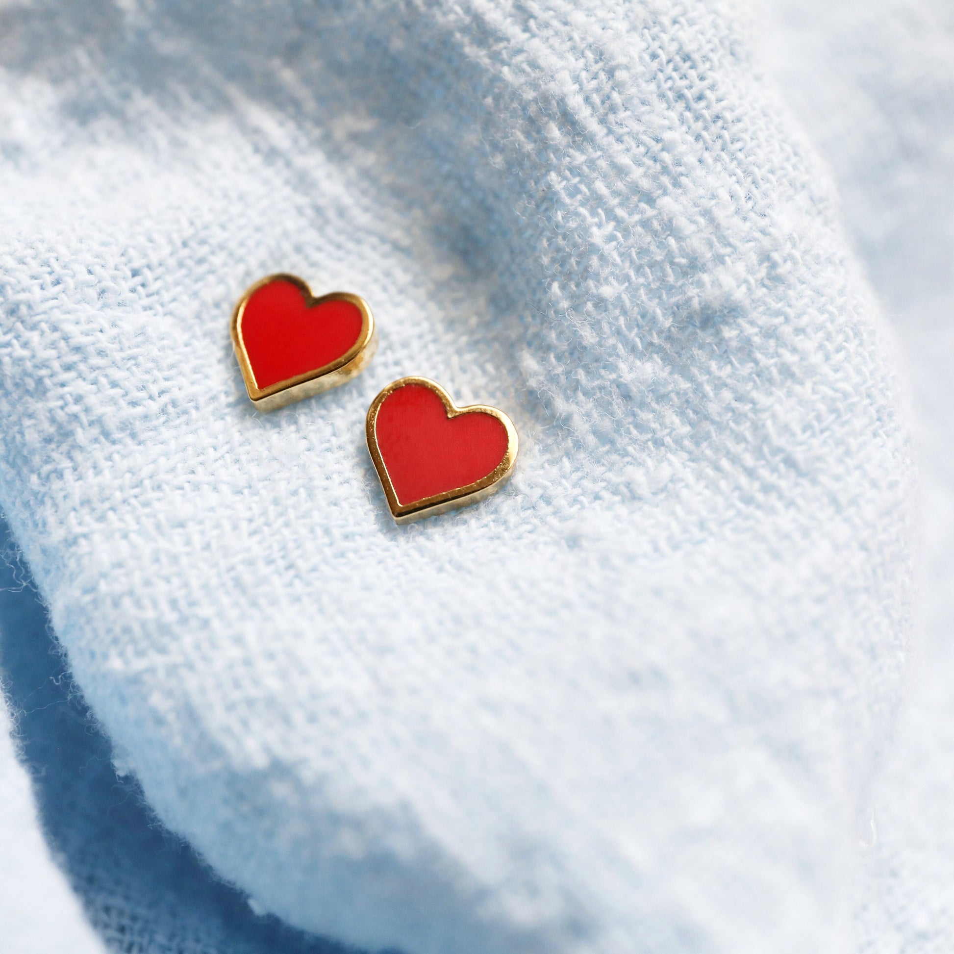 Beautiful and lovely super tiny gold and red heart stud earrings. The post material is 92.5 sterling silver, and the rainbow is matte gold-plated brass. Your earrings will ship in a gift box.